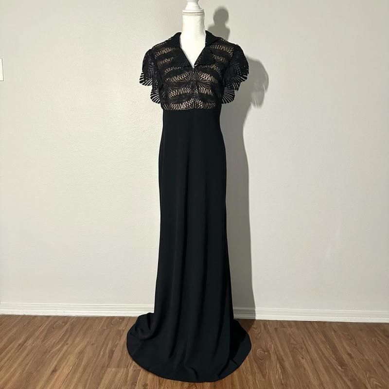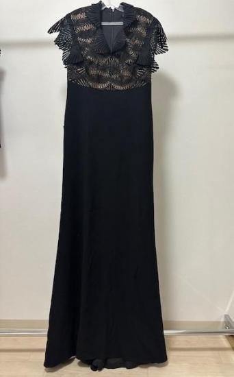 繊細ななレースが特徴的なこちらのドレス。立体的な襟が華やかさを添え、Vネックスタイルが洗練された印象を与えます。袖を隠す程度の長さ。クレープジャージー素材のフロアーレングスのスカートで、色彩のコントラストがクールでモダンな雰囲気を醸し出します。ウエスト位置が高めなので脚長効果が期待できます。また、露出が抑えられているため、さまざまなフォーマルなシーンで着用できる理想的な一着です。