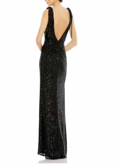 さらに、背中を美しく魅せるオープンバックデザインが視線を惹きつけ、エレガントな後ろ姿を演出。特別な日の装いにふさわしい一着です。