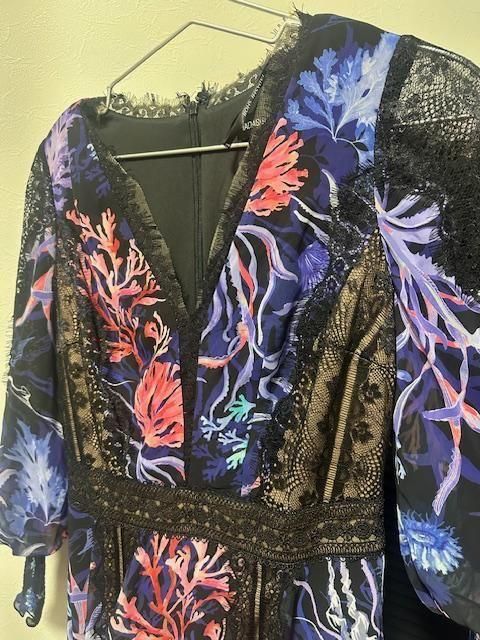水族館を連想させるエレガントで優美な柄。シフォン素材とブラックレースで高級感のあるドレス。