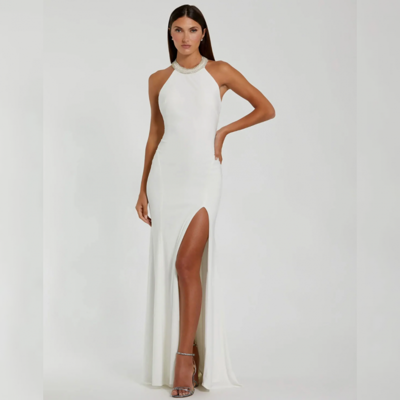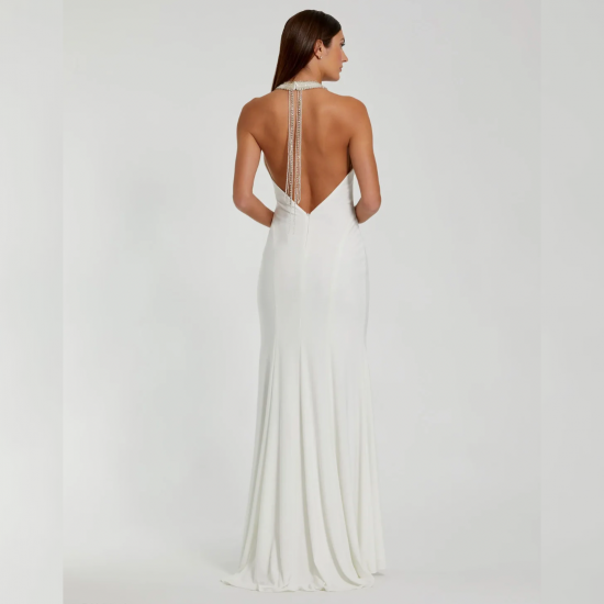 ビーズとラインストーンで精巧に装飾されたホルターネックが、洗練された輝きを放つジャージーロングドレス。流れるようなシルエットがエレガントな印象を与え、太ももまで入ったスリットが程よい抜け感と華やかさを演出します。動くたびに美しく揺れるデザインが、特別なシーンで圧倒的な存在感を放つ一着です。
