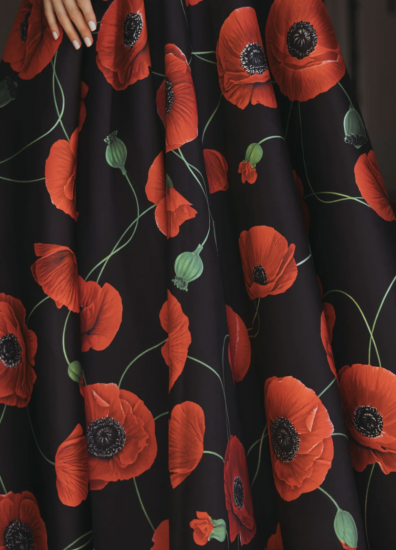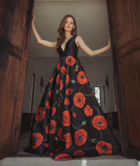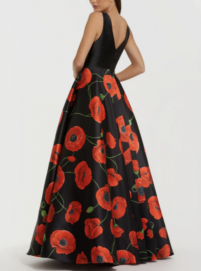 エレガントなVネックのAラインロングドレス。黒をベースに、スカート部分に咲き誇る鮮やかなフローラル柄が映える、気品あふれる一着です。上品さと華やかさを兼ね備えた高級感のあるデザインが魅力。