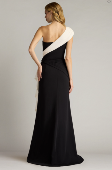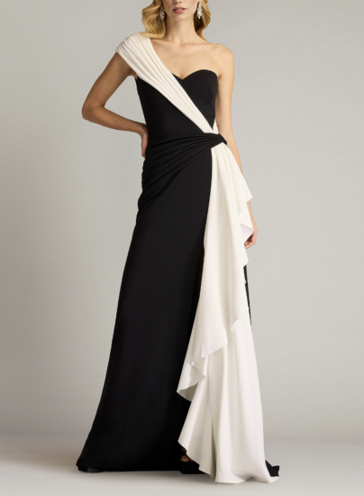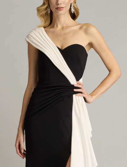 片方のショルダーからはドラマティックなプリーツのサイドウォーターフォールサッシュが流れるように広がり、生地のしなやかなドレープを際立たせます。