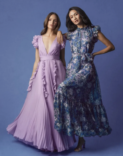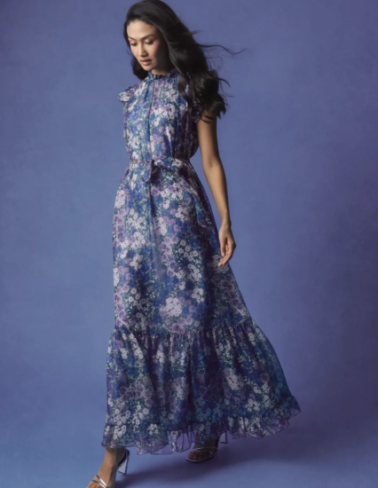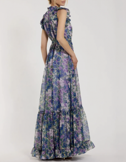 この華やかなフローラルプリントのシフォンガウンは、シックなモックネックラインとエレガントなフリルスリーブが特徴です。ウエストのベルトがスタイルを引き立て、あらゆるシーンにふさわしい一着となっています。